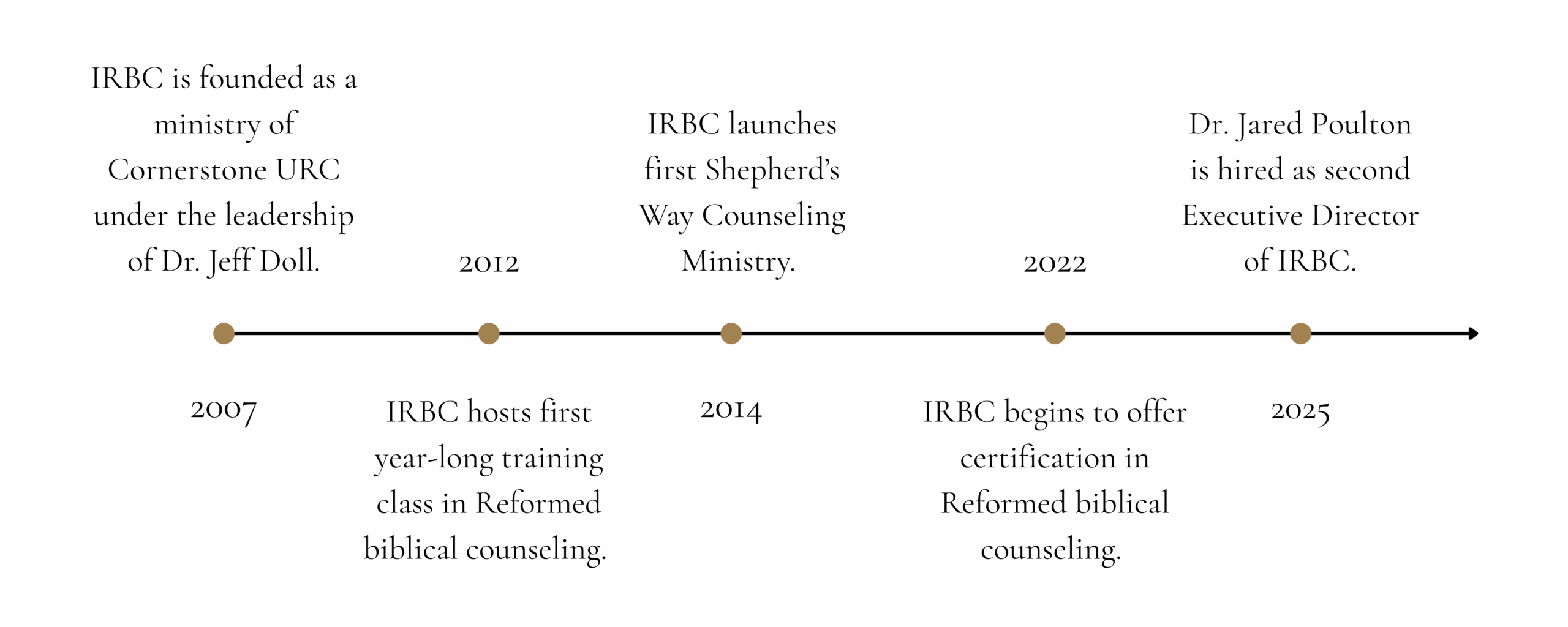 In 2007, two elders of Cornerstone United Reformed Church in Hudsonville, Michigan, reached out to pastor Jeff Doll with a significant concern. As they reflected upon their labors among their respective elder districts, both men felt underequipped to shepherd the souls under their care. They needed help. Dr. Doll led the two elders into the empty sanctuary to ask the Lord for wisdom in addressing this need. In that time of prayer, God planted the initial seeds of the Institute for Reformed Biblical Counseling (IRBC).